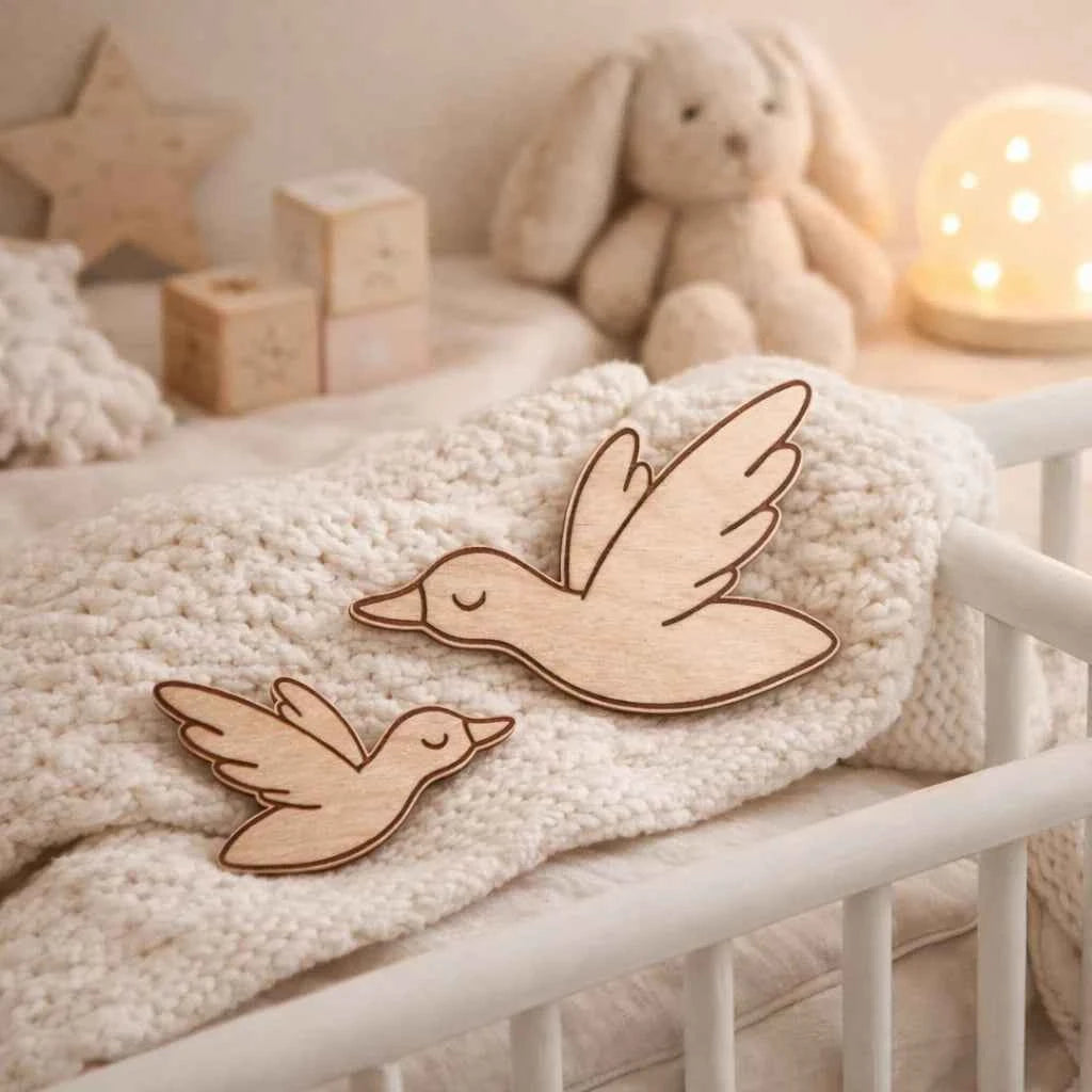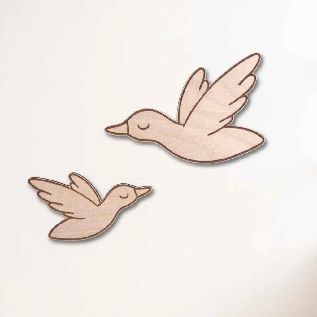 Skab en rolig og fantasifuld stemning på børneværelset med disse eventyrfugle i træ. Sættet består af en stor og en lille fugl, der svæver side om side som en enkel og dekorativ vægpynt. Fuglene passer perfekt ind i et nordisk børneunivers med bløde former og naturlige materialer.