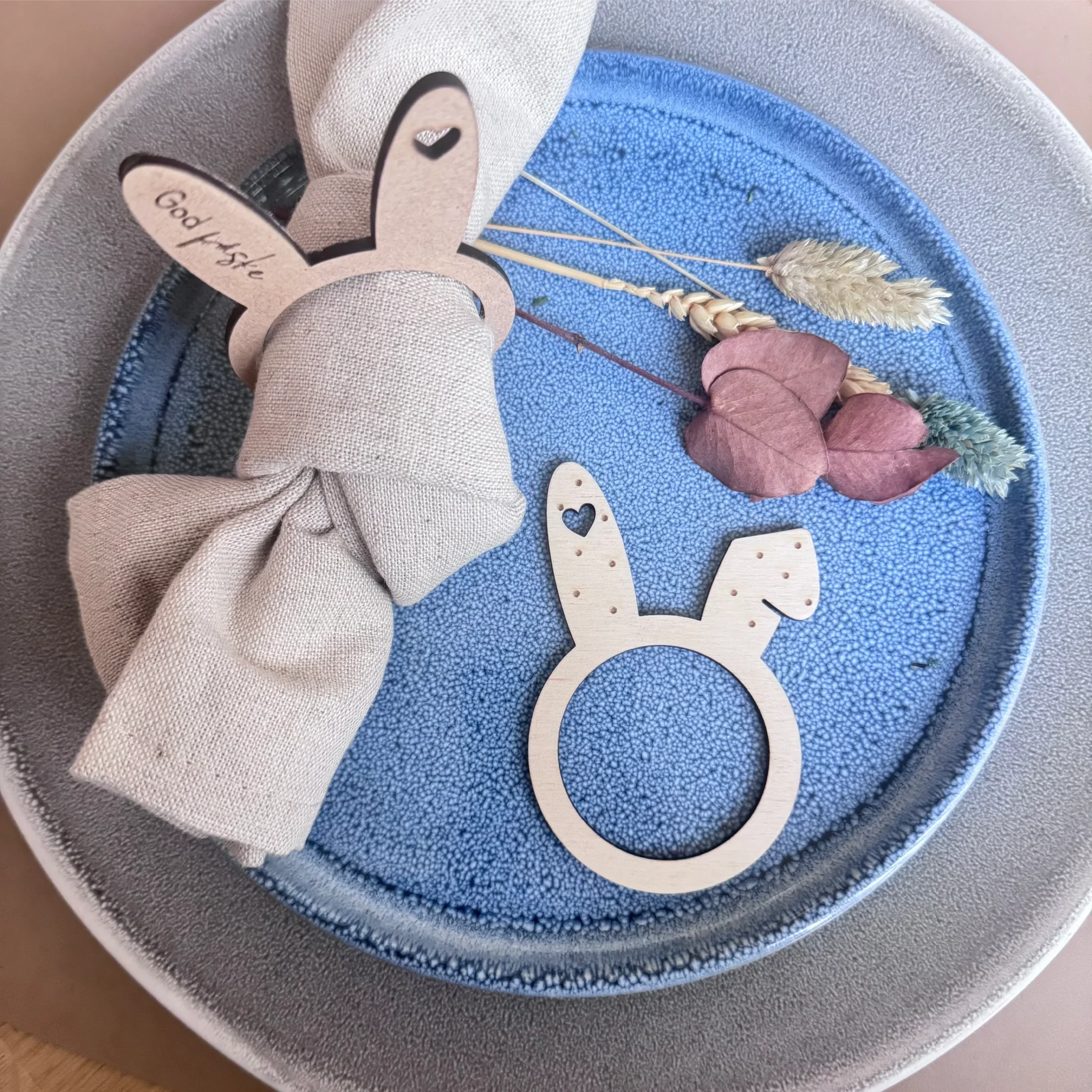 Gør borddækningen personlig med disse servietringe i træ formet som små kaninører. En legende detalje til påskebordet og forårets fester, der får både børn og voksne til at smile.