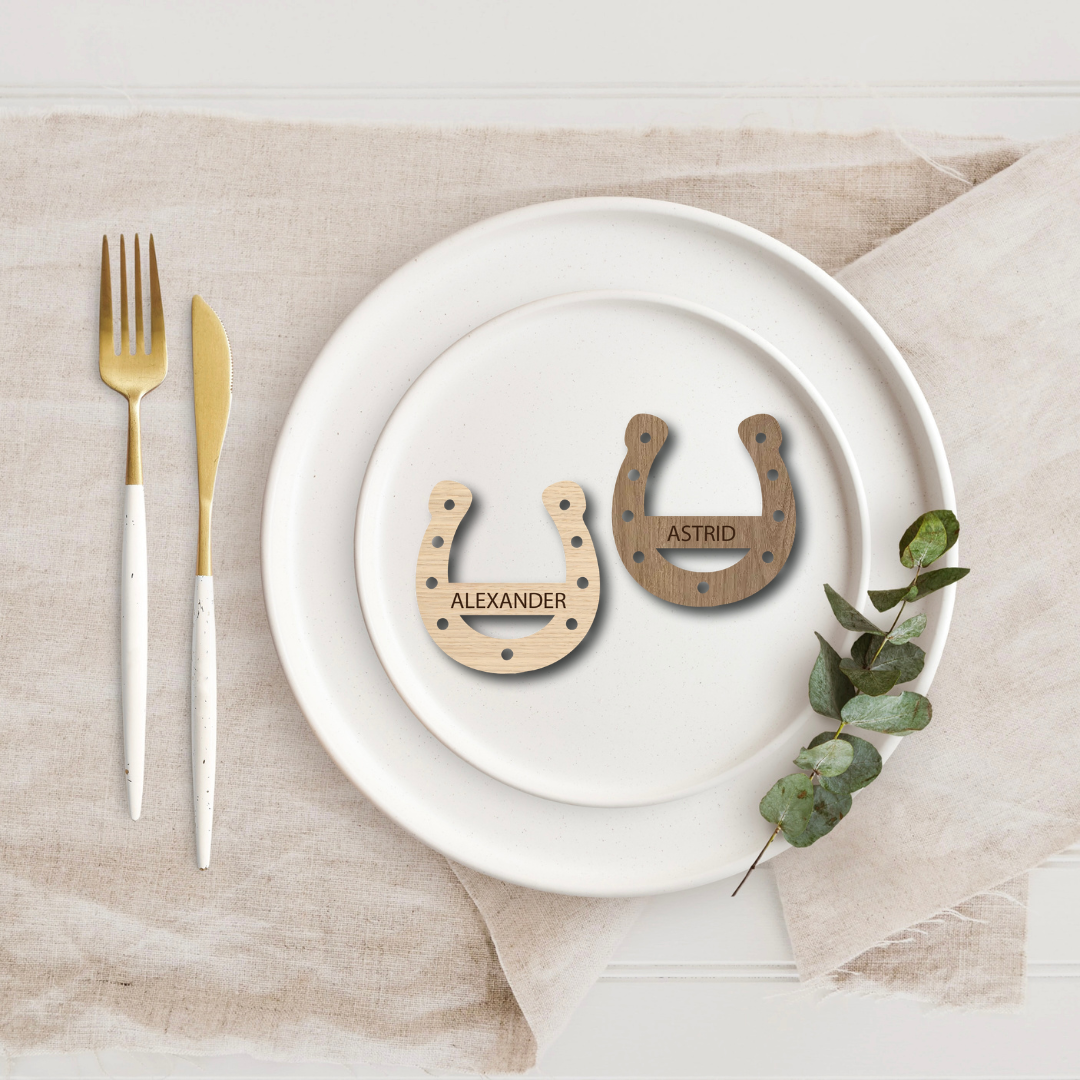 Gør konfirmationsbordet endnu mere personligt med disse elegante bordkort i træ formet som en hestesko – et symbol på held og lykke! Perfekte til at skabe en smuk og gennemført borddækning, der imponerer gæsterne og skaber minder om den store dag.