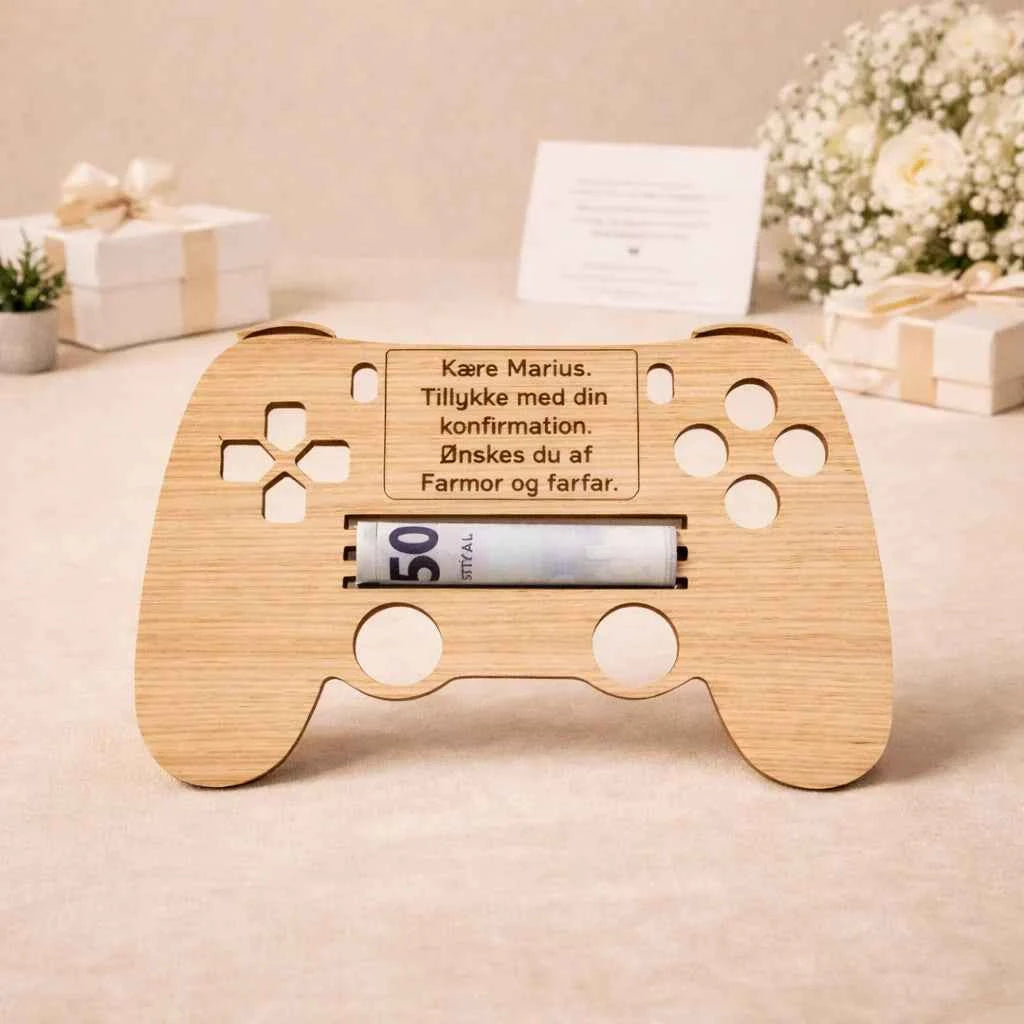 Denne personlige pengegave i træ er formet som en gamer controller og graveres med navn og valgfri hilsen. Perfekt til konfirmation, fødselsdag eller som gave til gaming-entusiasten.