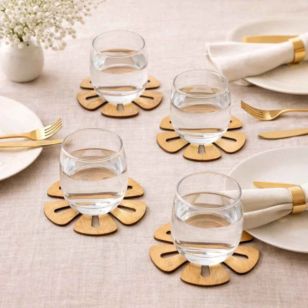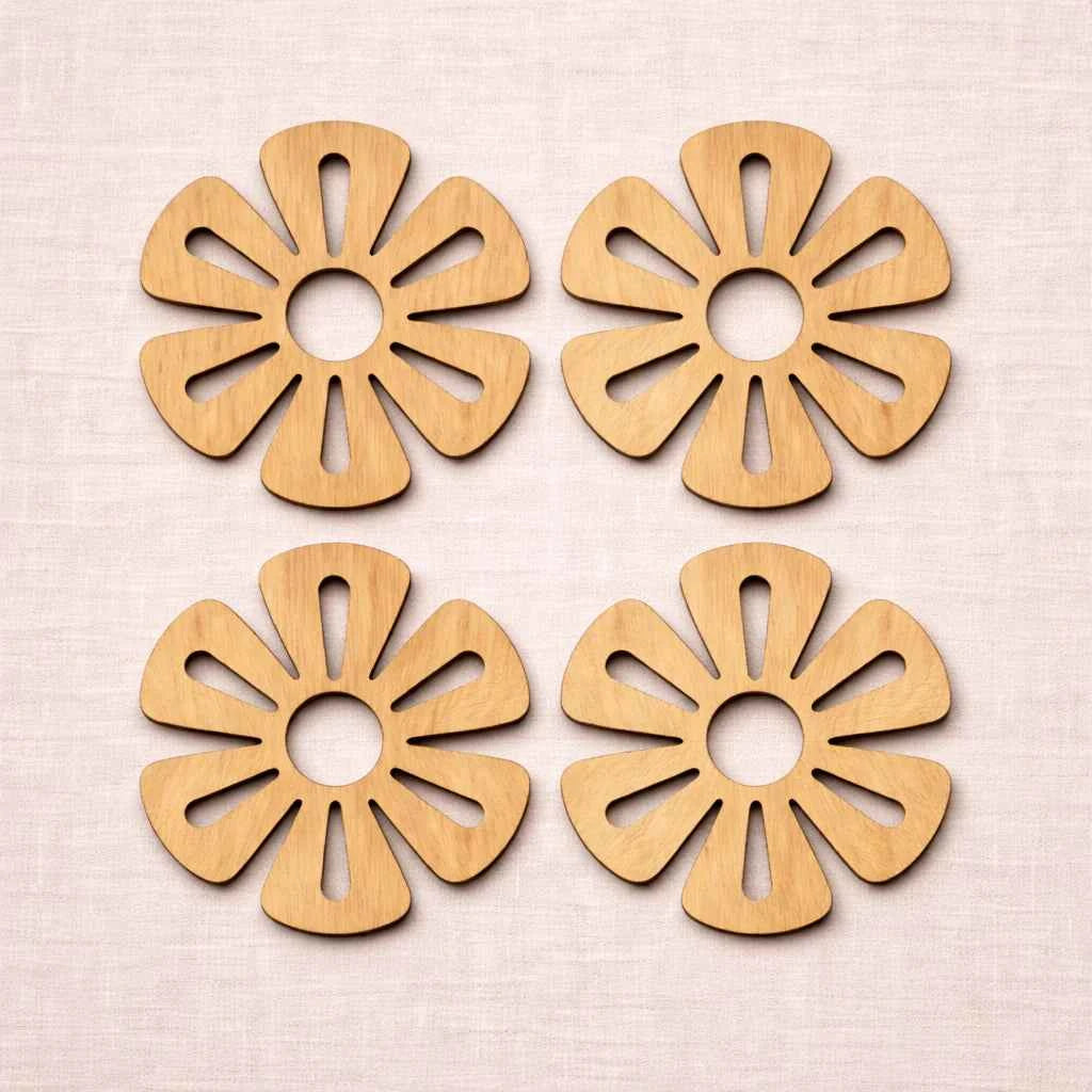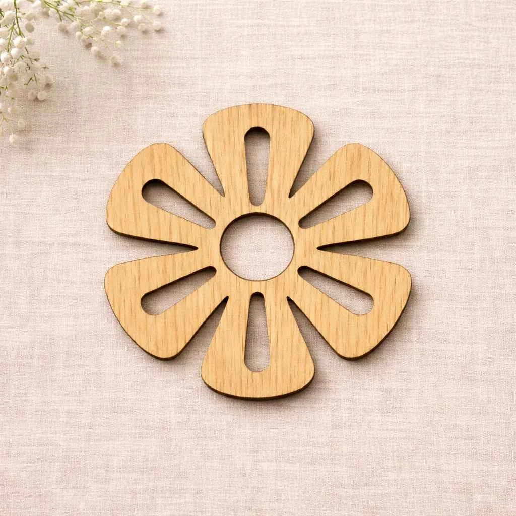 Disse blomstformede glasbrikker i træ er designet til en enkel og stilren borddækning. De skæres med præcision i lyst træ og har et åbent mønster, som giver et let og elegant udtryk. Samtidig beskytter formen bordet mod ringe og varme – og fungerer som en naturlig del af bordets samlede æstetik.